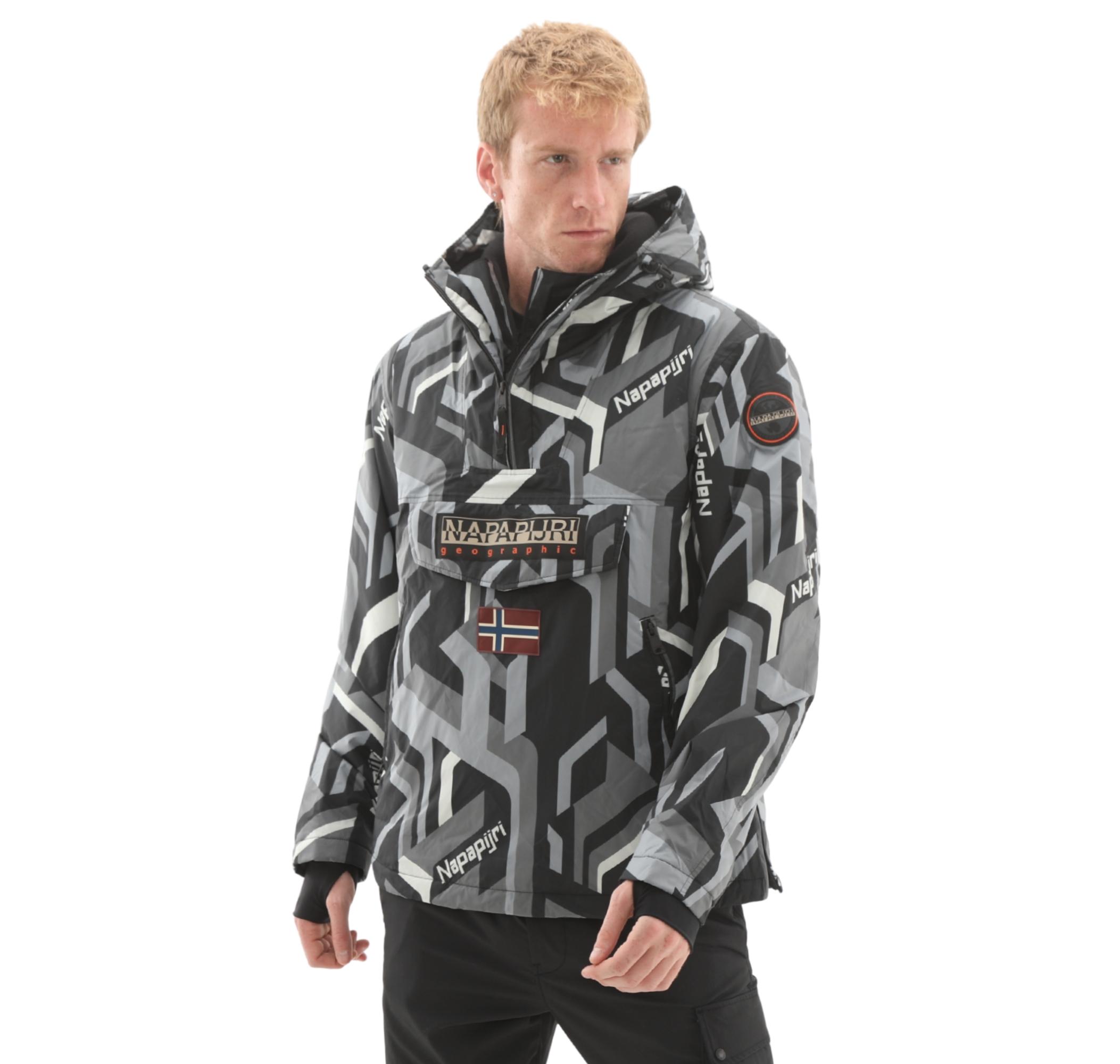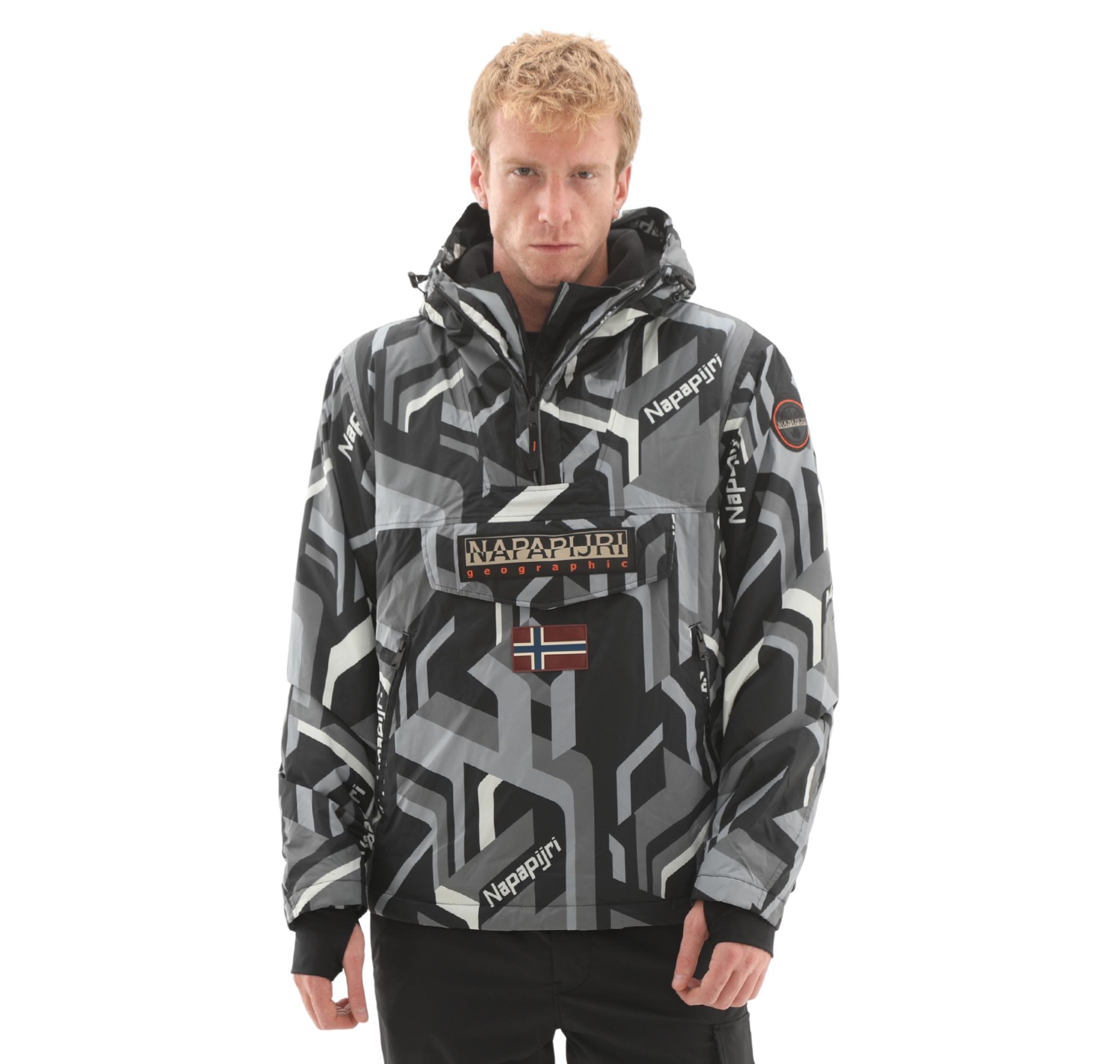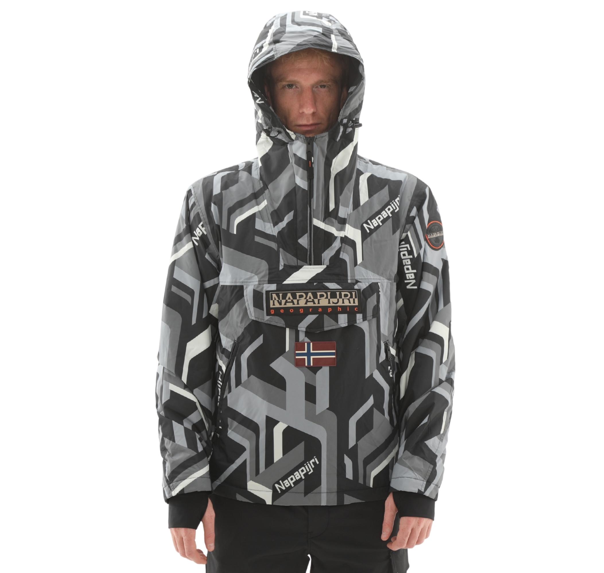 - Tasarım: Modern geometrik AOP deseni (siyah, gri, beyaz). Napapijri logosu, Norveç bayrağı detayı. Yarım fermuarlı, ayarlanabilir kapüşonlu anorak kesim.