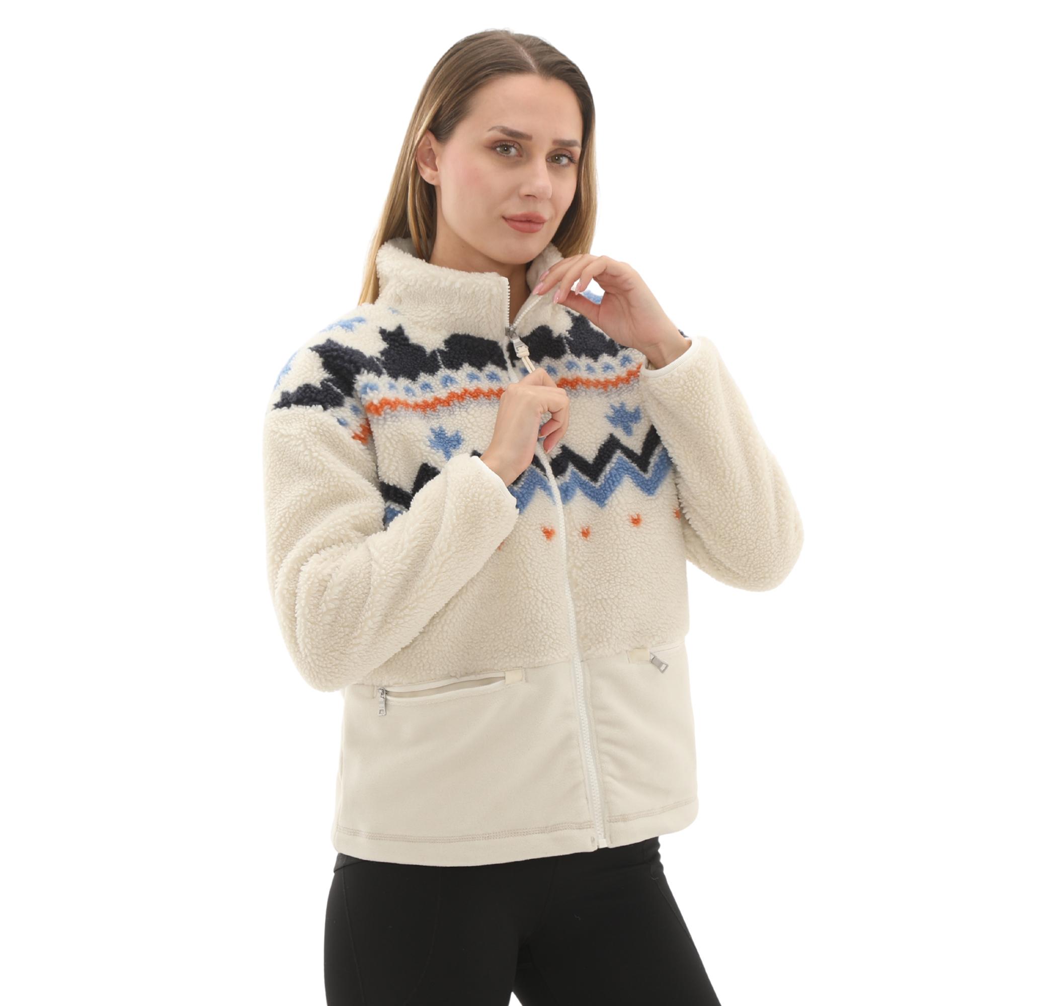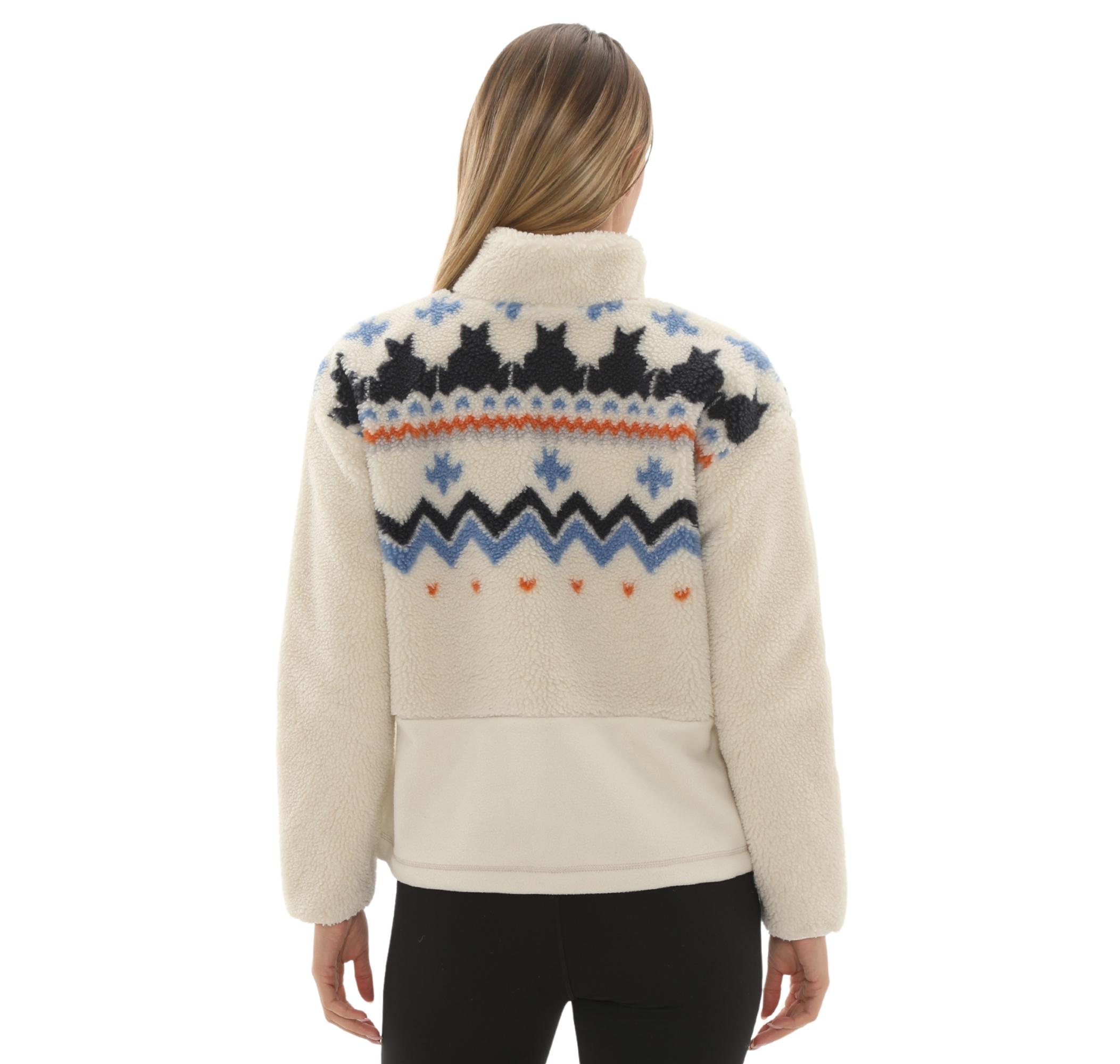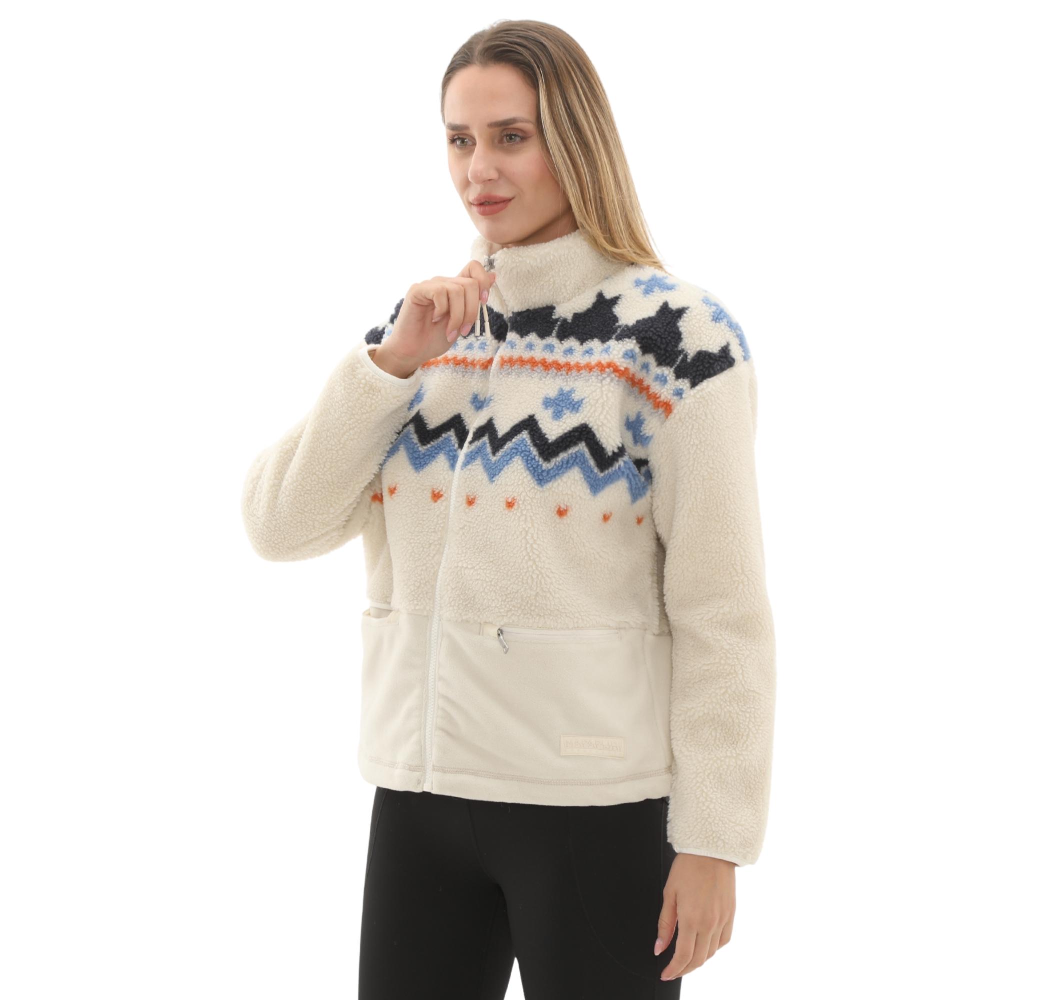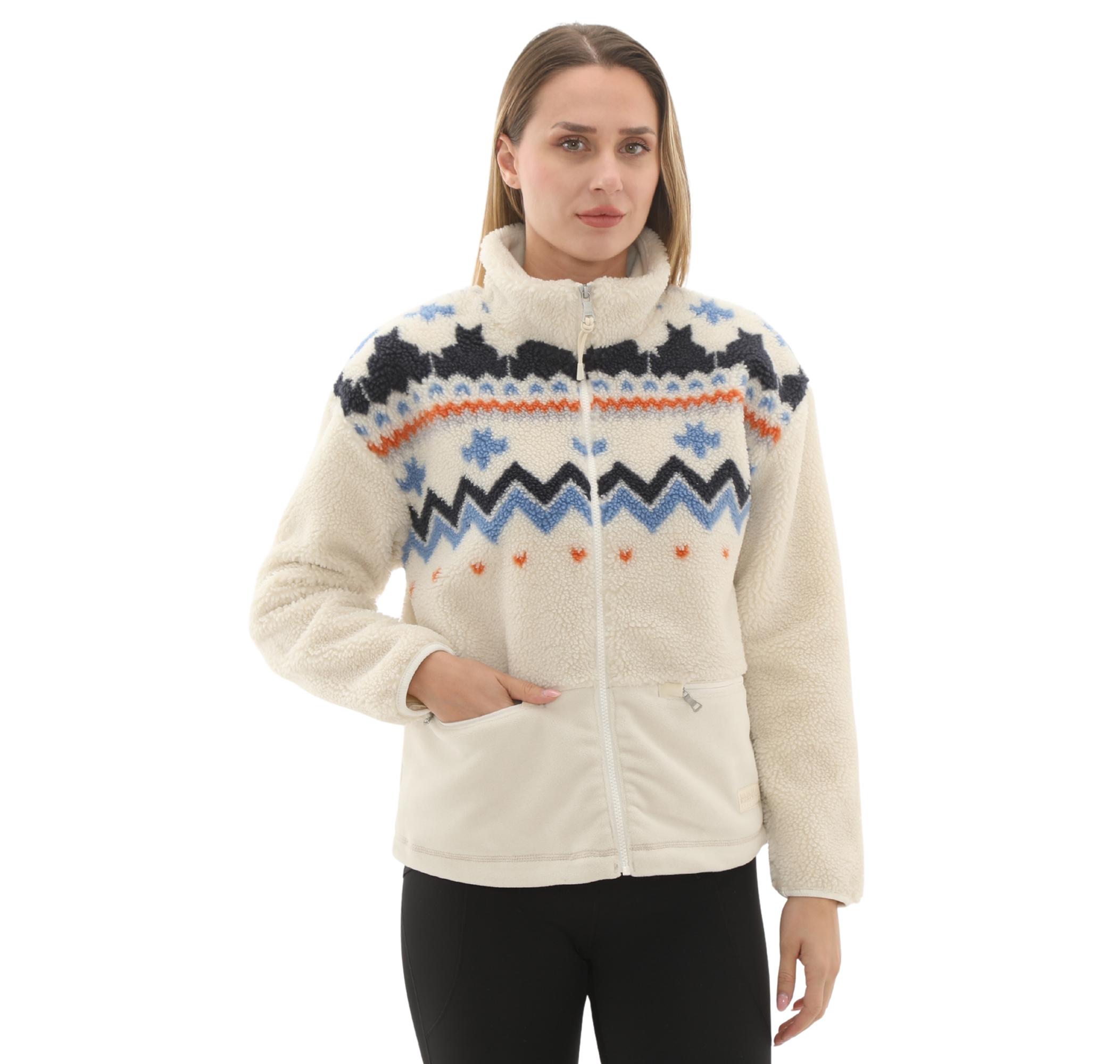 Ceketin krem rengi gövdesi, omuz ve göğüs bölgesinde yer alan, koyu lacivert, açık mavi ve turuncu renklerdeki kuzey esintili dinamik desenlerle çarpıcı bir görünüm kazanır. Yakadaki ve cep üzerindeki zarif Napapijri logosu kalitesini vurgular.