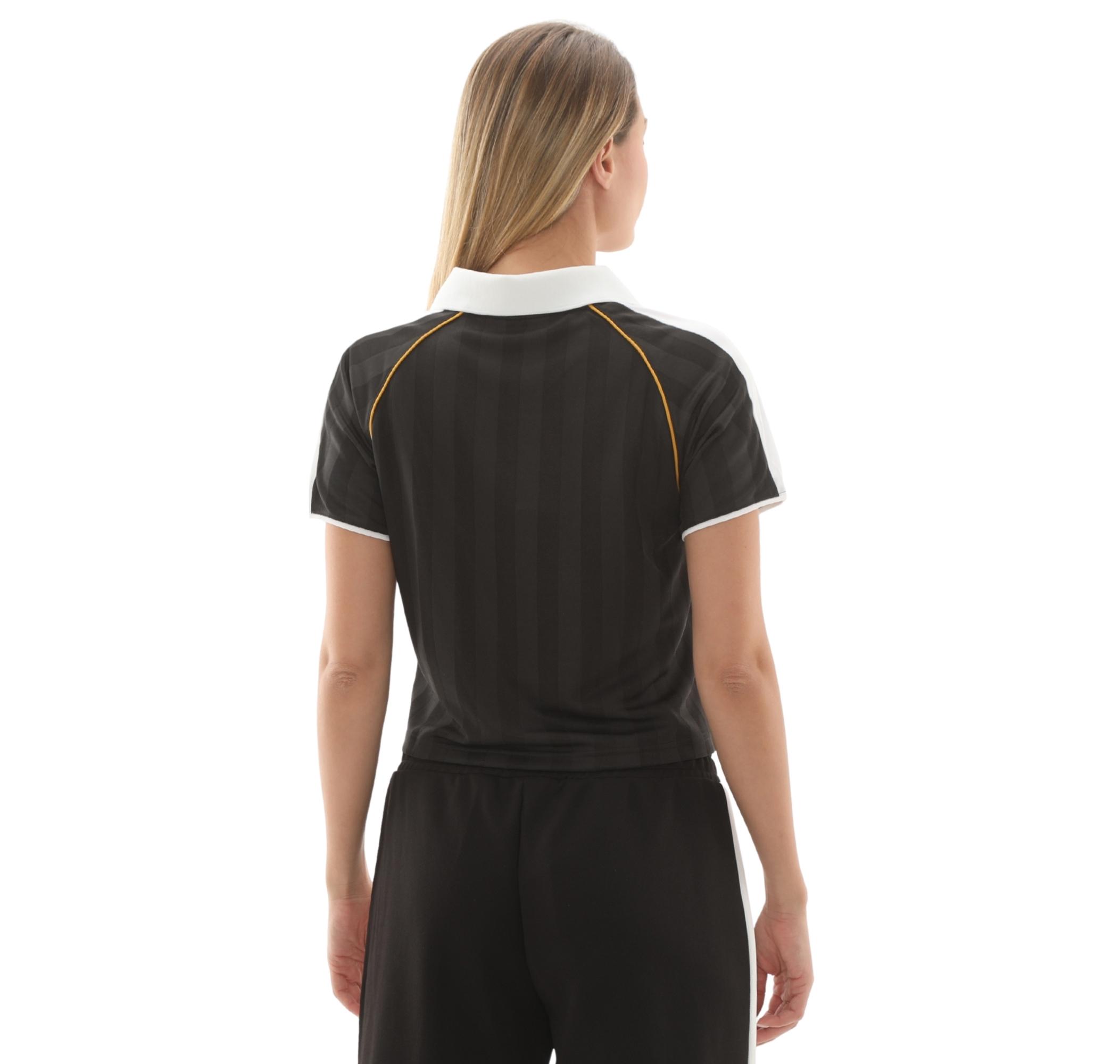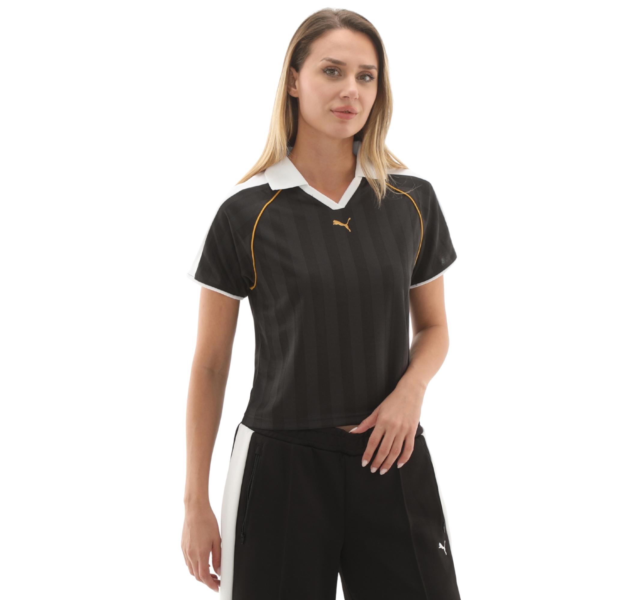 Puma T7 Relaxed Football Jersey Kadın T-Shirt, klasik futbol formasını modern bir yorumla birleştirerek retro şıklık ve üstün konfor sunar. Dikey çizgili siyah kumaş üzerine beyaz polo yaka, manşetler, ikonik altın sarısı T7 şeritleri ve sol göğüste yer alan altın PUMA Cat logosu ile stilinizi tamamlar.
