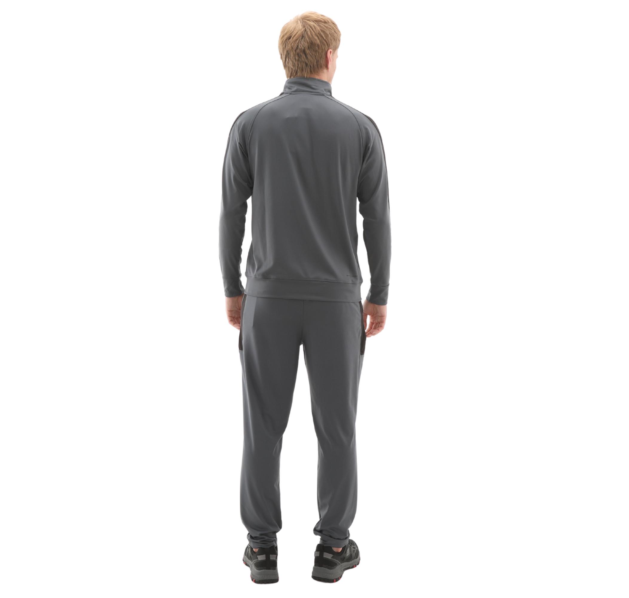 Antrasit gri takım, sportif şerit detayları ve minimalist Skechers "S" logosuyla dikkat çeker. Tam boy fermuarlı dik yaka üst ve rahat kesim alt eşofman, elastik manşetler/bel ve yan ceplerle fonksiyonellik sunar.