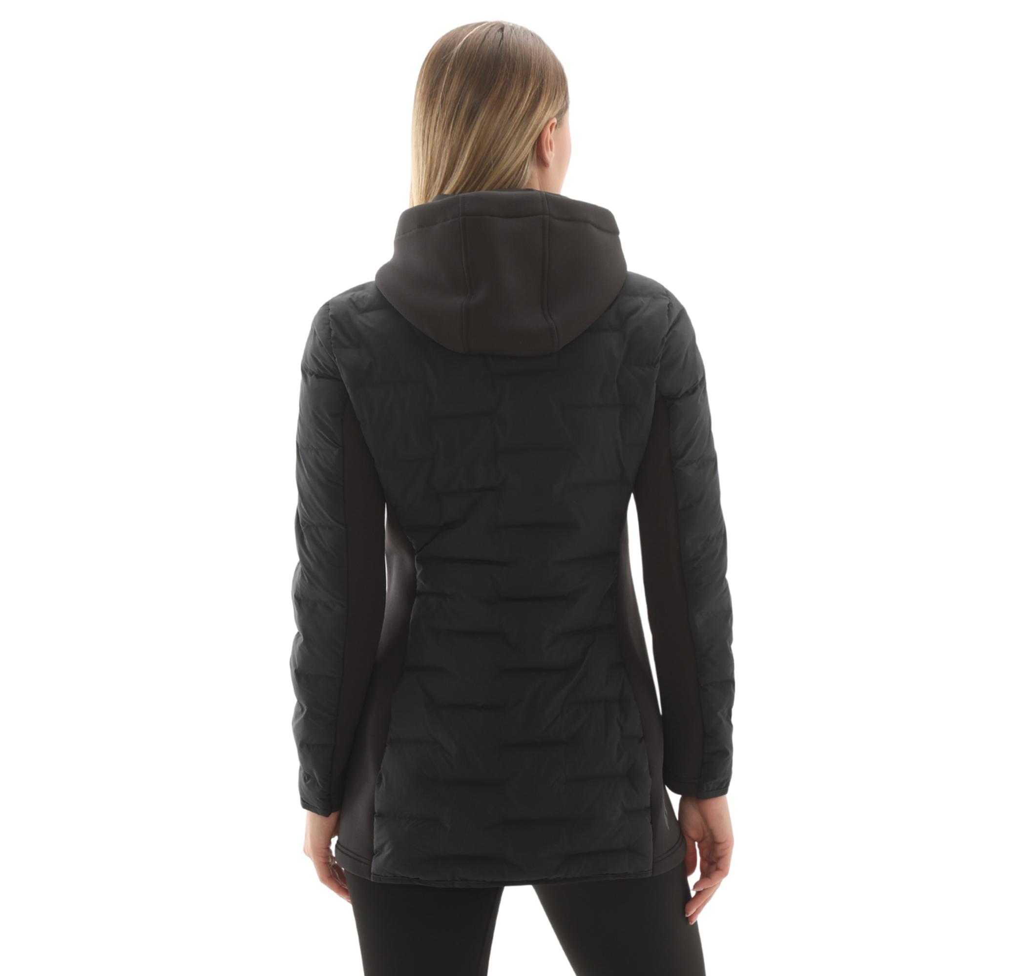 Sade siyah tasarımı, vücuda nazikçe oturan kesimiyle kadınsı silüeti vurgular. Tam fermuar, entegre kapüşon ve fermuarlı yan cepler pratik kullanım ve eşyalarınız için güvenli depolama sunar.